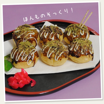 たこ焼きそっくりなプチシュー!たこ焼きソースはチョコレートソース、鰹節は固形のミルクチョコレートを刻んだもの、青のりは抹茶、マヨネーズはホワイトチョコレート、そして紅ショウガはチェリーを刻んだもの。アイデア満載アレンジ☆